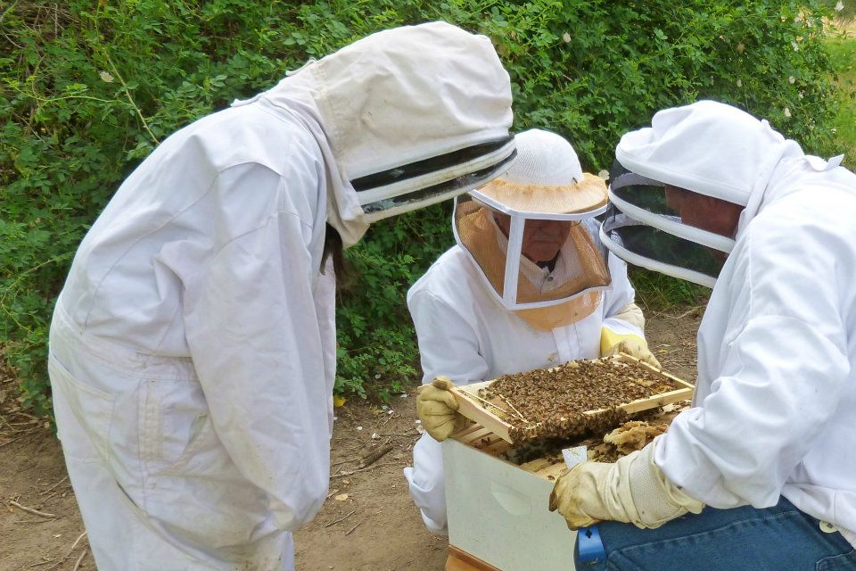 Still looking for the Queen. Three bee hoods make for a tricky huddle.